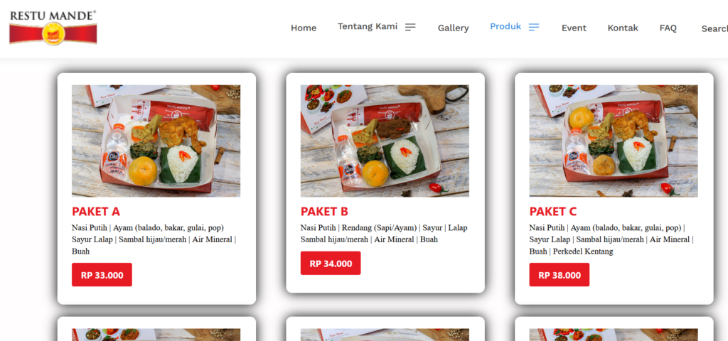 Pertama, buka website Restu Mande. Setelah itu, langsung jelajahi berbagai pilihan menu nasi box. Kami merancang paket menu lengkap, mulai dari masakan tradisional khas Minang sampai kreasi modern untuk acara kekinian. Klik di sini untuk membuka website Restu Mande